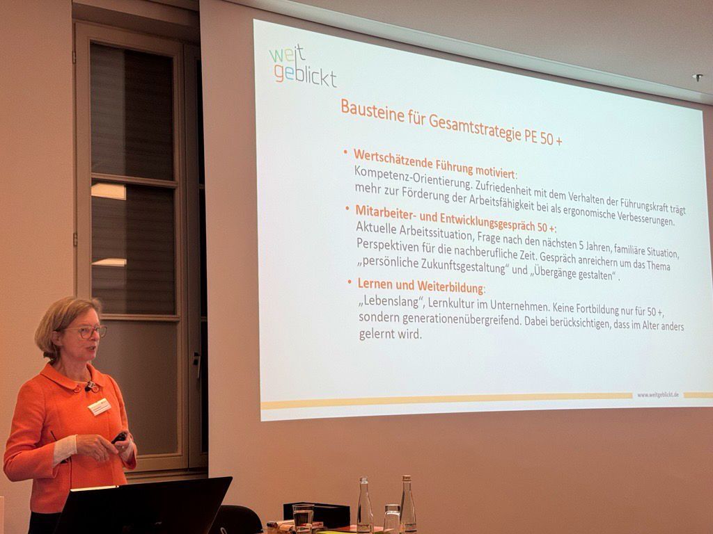 … beim zweitägigen Kompaktworkshop „Antworten auf den Fachkräftemangel. Personalentwicklung 55+ - Kompaktworkshop für Geschäftsführungen, Bereichs- und Einrichtungsleitungen am 8. und 9. Oktober 2024 in Stuttgart. Mit Gabriele Bartsch und Dr. Christine Dörner. Wir vernetzen Inputs und praktische Übungen. Gemeinsam analysieren wir Trends, Stärken und Schwächen im Blick auf Führung, Organisationskultur und Prozesse in Ihrer Organisation, erarbeiten ein tragfähiges Zukunftsbild und entwickeln Lösungsschritte. Am Ende stehen individuelle Umsetzungskonzepte und wir bereiten gemeinsam Ihren Praxistransfer vor.